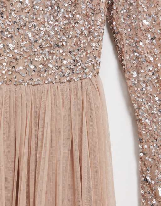 Product Name: Maya bridesmaid long sleeve maxi tulle dress with tonal delicate sequins in taupe blush discount